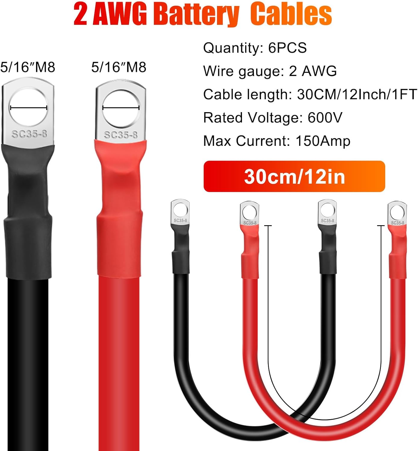 #2 AWG Battery Cable 12in Set w/ M8 Lugs