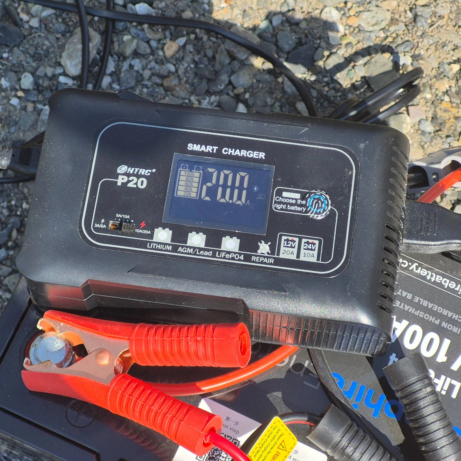 Compact, capable, and travel-friendly — the HTRC P20 keeps your Sapphire Energy batteries ready to go. It supports both 12V and 24V systems across lithium (LiFePO4) and lead-acid chemistries with safe, microprocessor-controlled multi-stage charging.